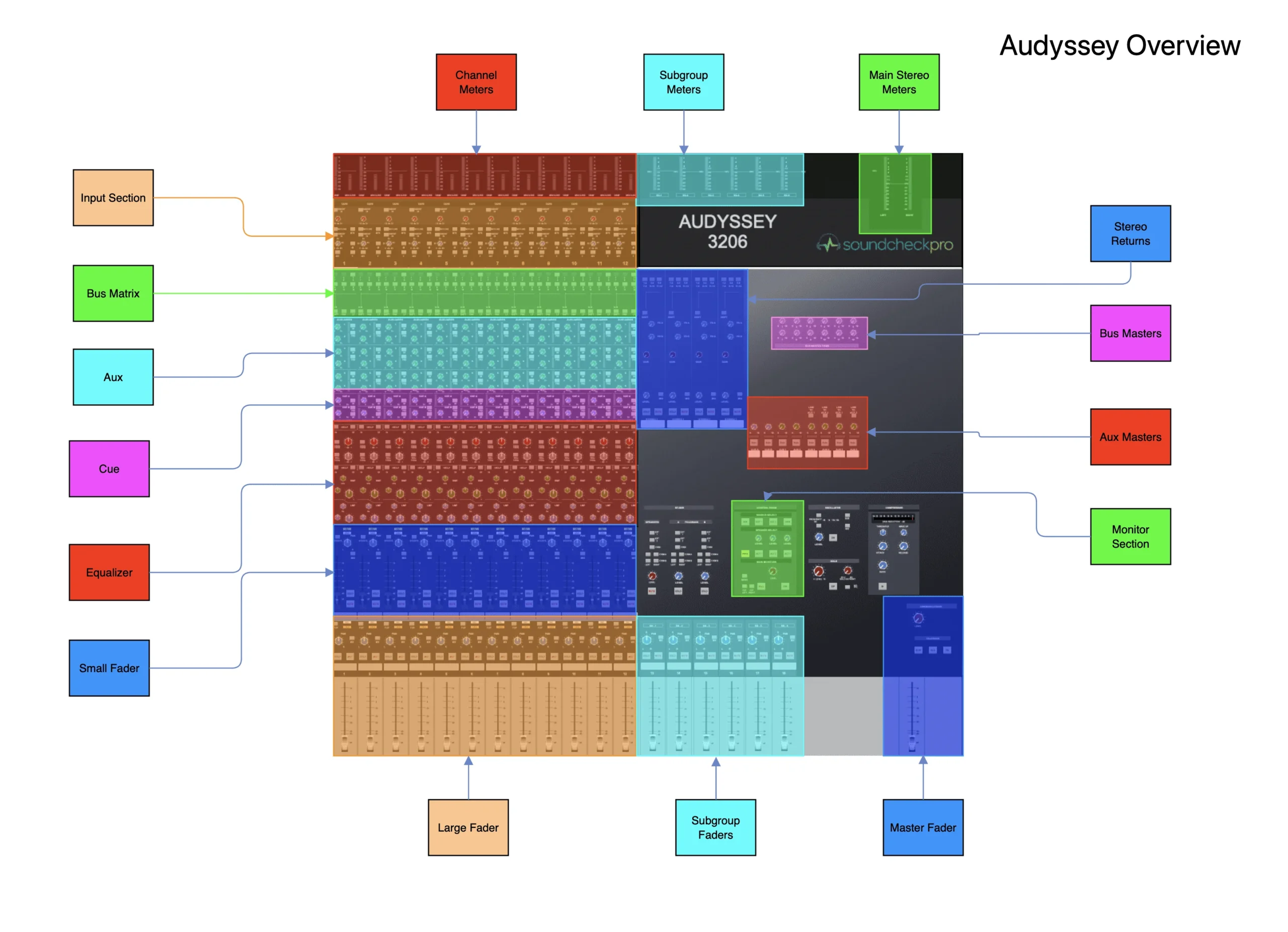The Audyssey console is the first IN-LINE console in SoundcheckPro that showcases the full journey of audio signal flow. Both channel & monitor paths are positioned on vertical channelstrips.