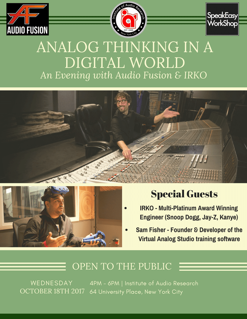 Several weeks later, we partnered up again to bring Multi-Platinum Engineer, IRKO, to the event hall to share his experience working in analog-equipped studios around the world. To read more about this event, click here.