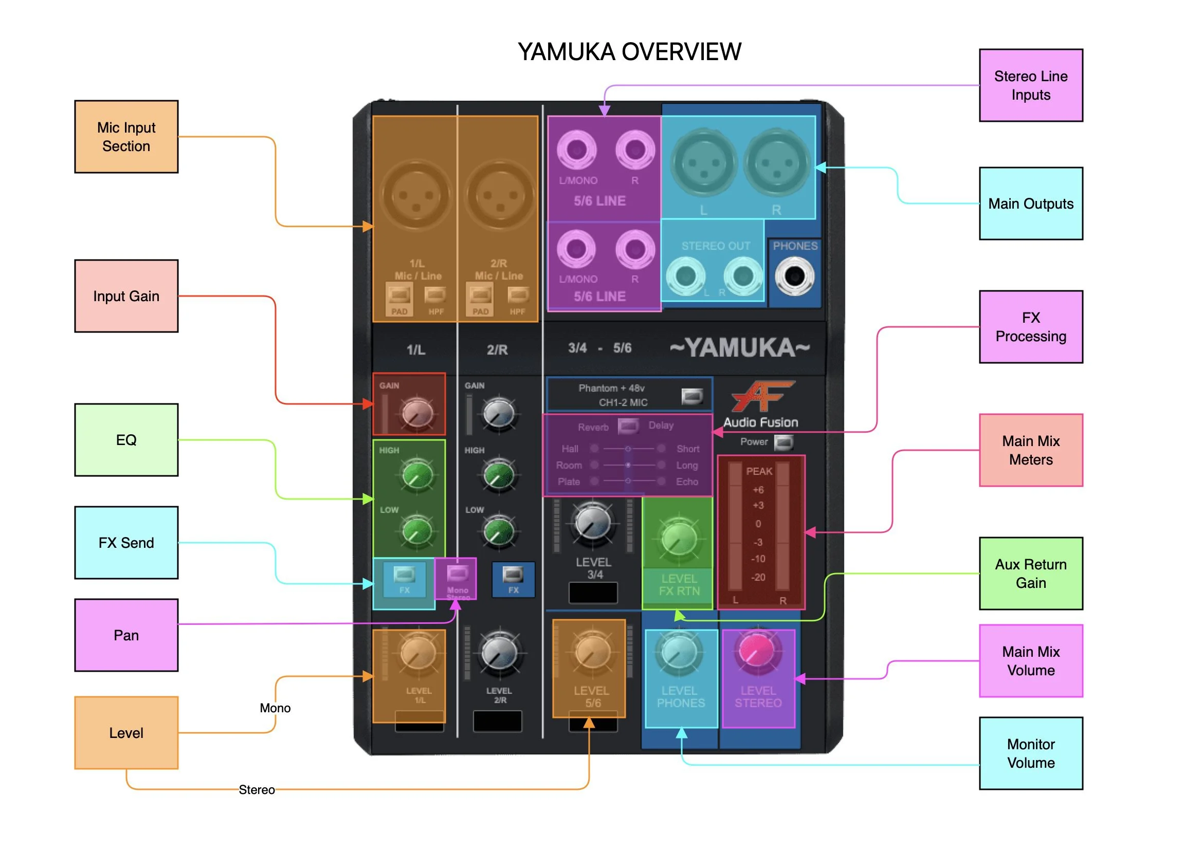 The Yamuka mixer is an ultra compact mixer that offers a few differences than many other mixers. Notably where other mixers typically have a dedicated pan knob, the Yamuka mixer has a "Mono/Stereo switch" which engages a hard panning of channels 1 to be all the way Left and for channel 2 to be panned all the way right. The FX sends are also internal where as many mixers require external routing to devices outside the mixer.